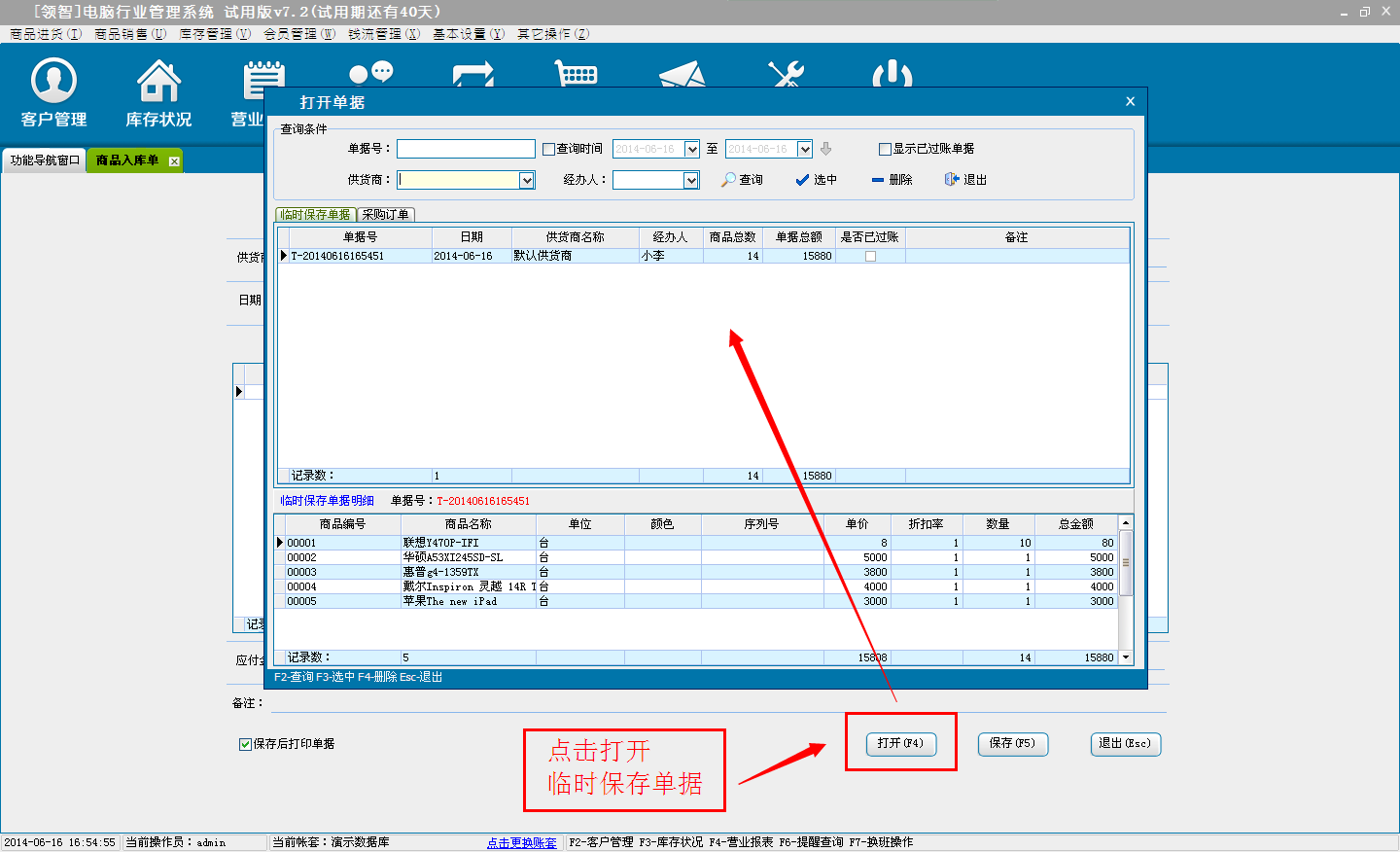 d:选择临时保存,单击确定后,单据将保存为临时采购进货单,不会对商品的库存和财务信息产生影响。临时单据可以在商品入库单“打开”按钮,在打开单据选择临时保存单据进行打开。