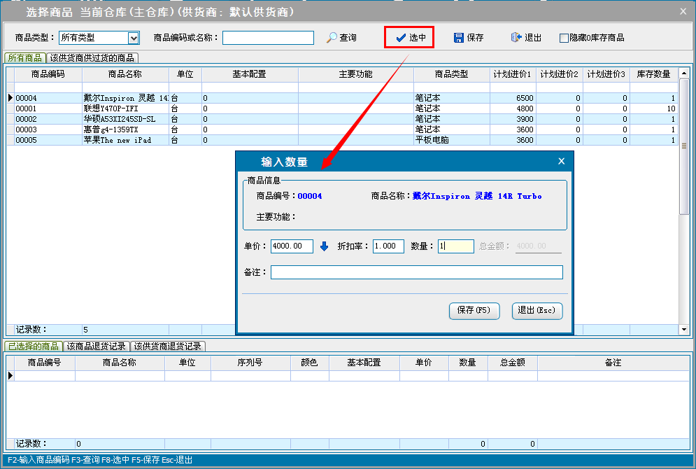 单击添加商品,进入选择商品窗口,添加退货商品信息。设置商品的价格,数量和折扣率,单击保存退出,返回采购退货界面。也可以单击导入excel通过excel文档导入退货的商品信息。