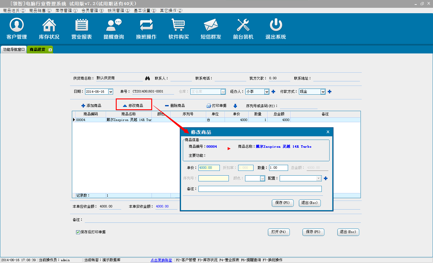 b:核对退货商品信息,可对添加的商品直接修改数量、单价和折扣率(折扣率为大于0小于等于1的小数,0.8即8折)。