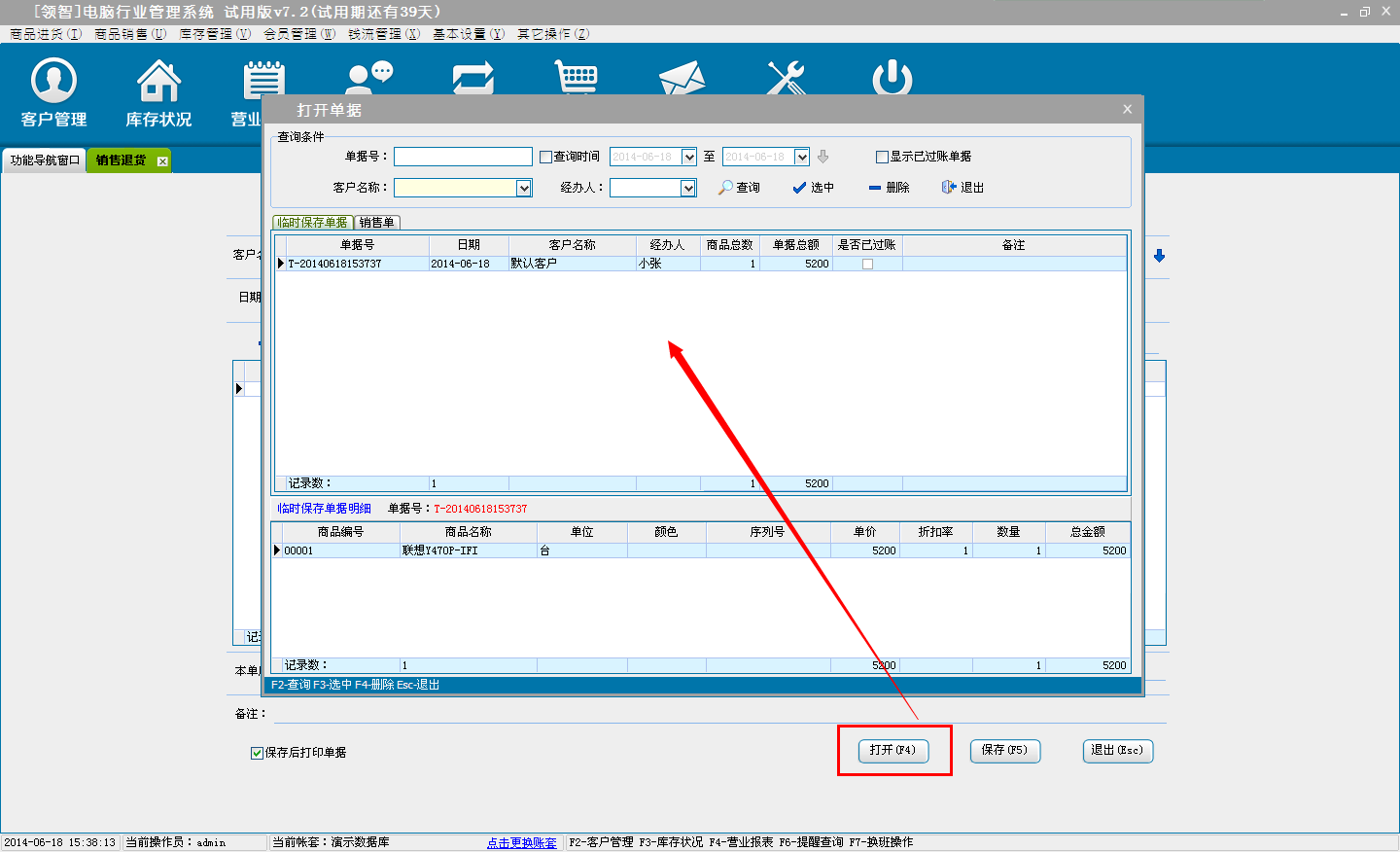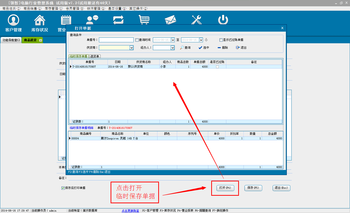 d:选择临时保存,单击确定后,单据将保存为临时商品退货单,不会对商品的库存和财务信息产生影响。临时单据可以在商品退货窗口单击打开按钮,在打开单据中选择临时保存单据进行打开。