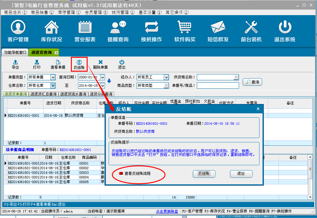 用于查询商品的采购进货、退货单据、商品进退货明细的汇总。包括进退货流水查询和进退货按商品类别汇总统计。选择单据,单击查看单据可查询该单据的商品明细信息。单击反结账对该单据进行反结账操作(反结账后的单据可在商品采购进货或退货窗口中,通过打开单据打开并进行再次结账处理)。