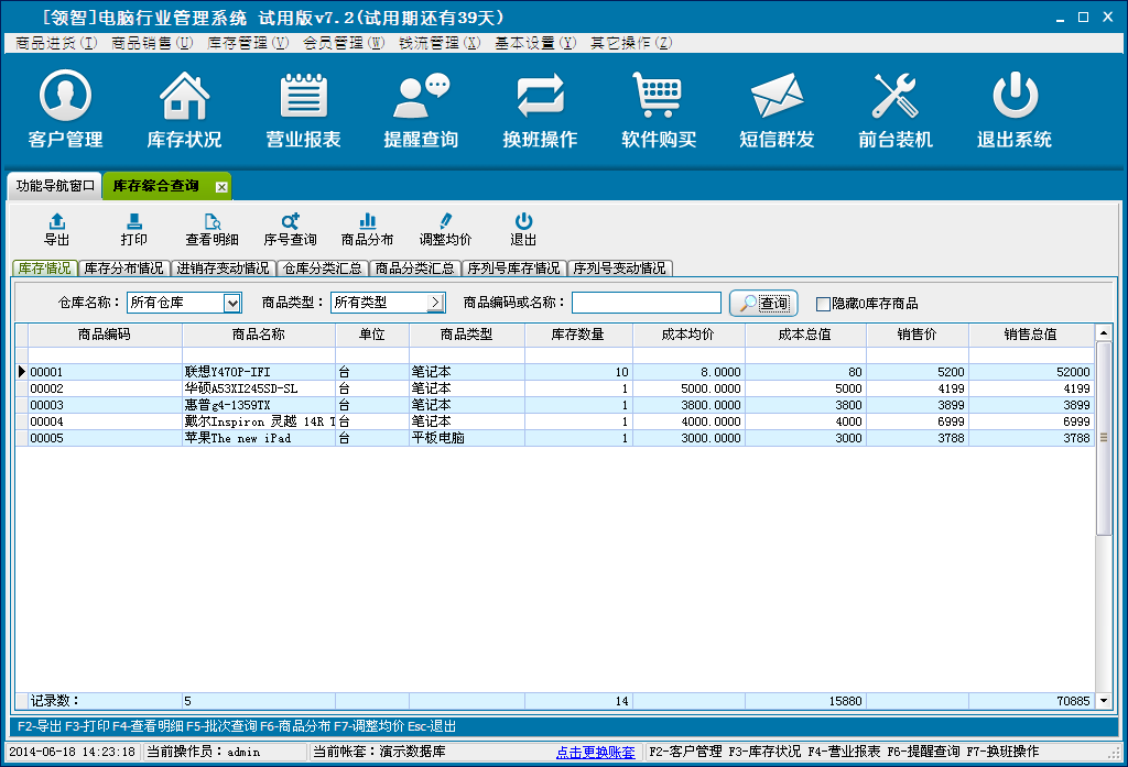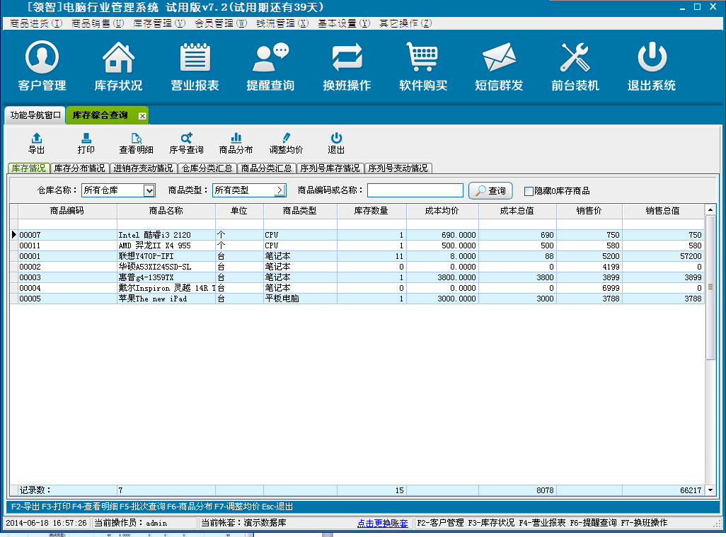 统计商品的库存情况,包括库存分布情况、电脑行业库存变动情况、仓库分类汇总统计、商品分类汇总统计。