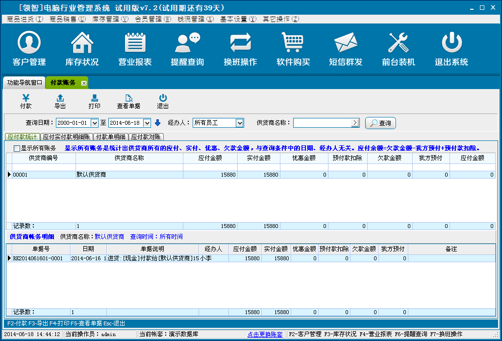 供货商往来账务是对应付款统计、应付实付款明细账、付款单明细、应付款对账的统计分析。并选择单据进行付款、导出和打印。