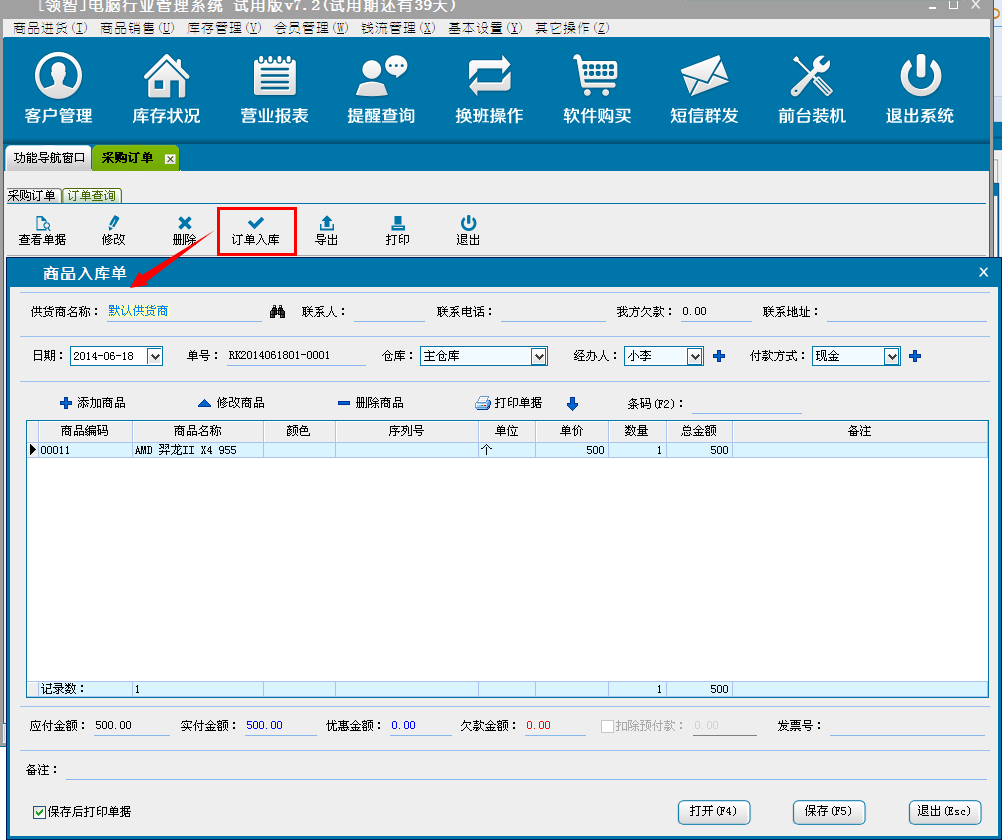 e:选择直接保存,单击确定后,单据将直接保存为正式的采购进货单,并对应更新相关仓库中的商品库存信息,可在采购查询中查询该单据信息。