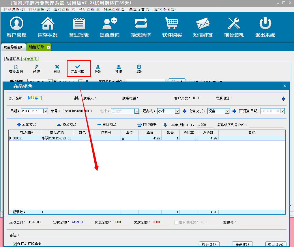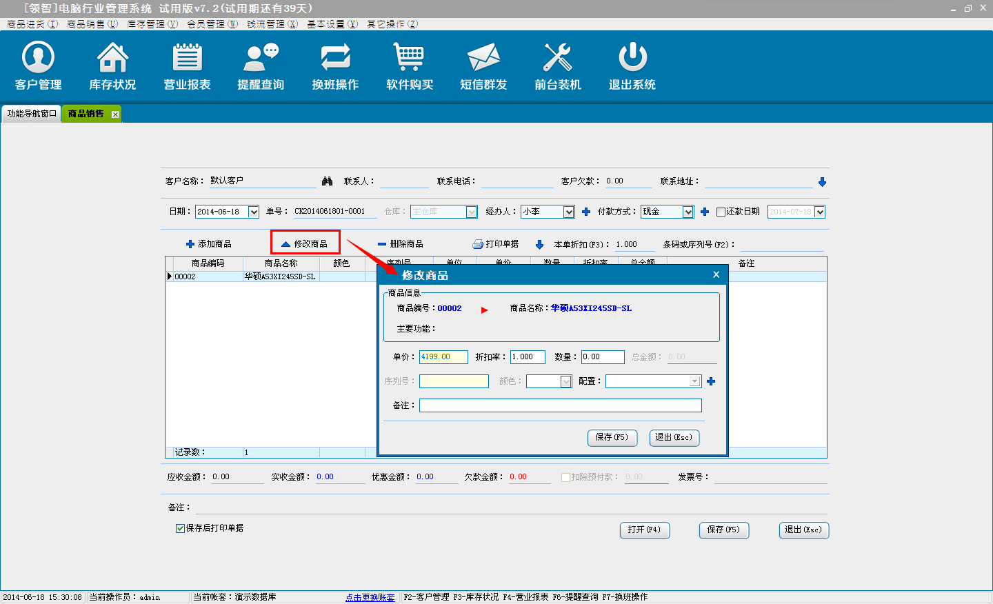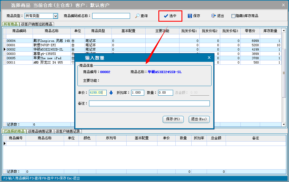 b:核对销售商品信息,可对添加的商品直接修改数量、单价和折扣率(折扣率为大于0小于等于1的小数,0.8即8折)。