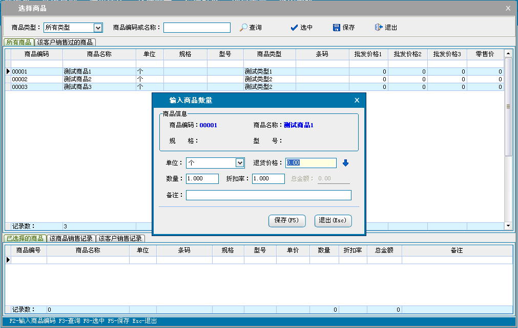 单击添加商品,进入选择商品窗口,添加销售商品信息。设置商品的销售价格,数量和折扣率,单击保存退出,返回商品销售界面。也可以通过excel文档导入销售的商品信息。