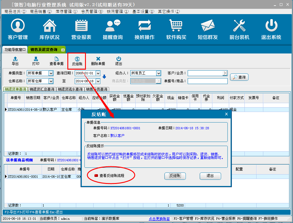 用于查询商品的商品销售、退货单据(含批发销售单和POS端零售单据)、销退货汇总查询。销退货流水查询(即销退货商品明细查询)和销退货按商品类别汇总统计。选择单据,单击查看单据可查询该单据的商品明细信息。单击反结账对该单据进行反结账操作(反结账后的单据可在商品销售或销售退货窗口中,通过打开单据打开并进行再次结账处理)