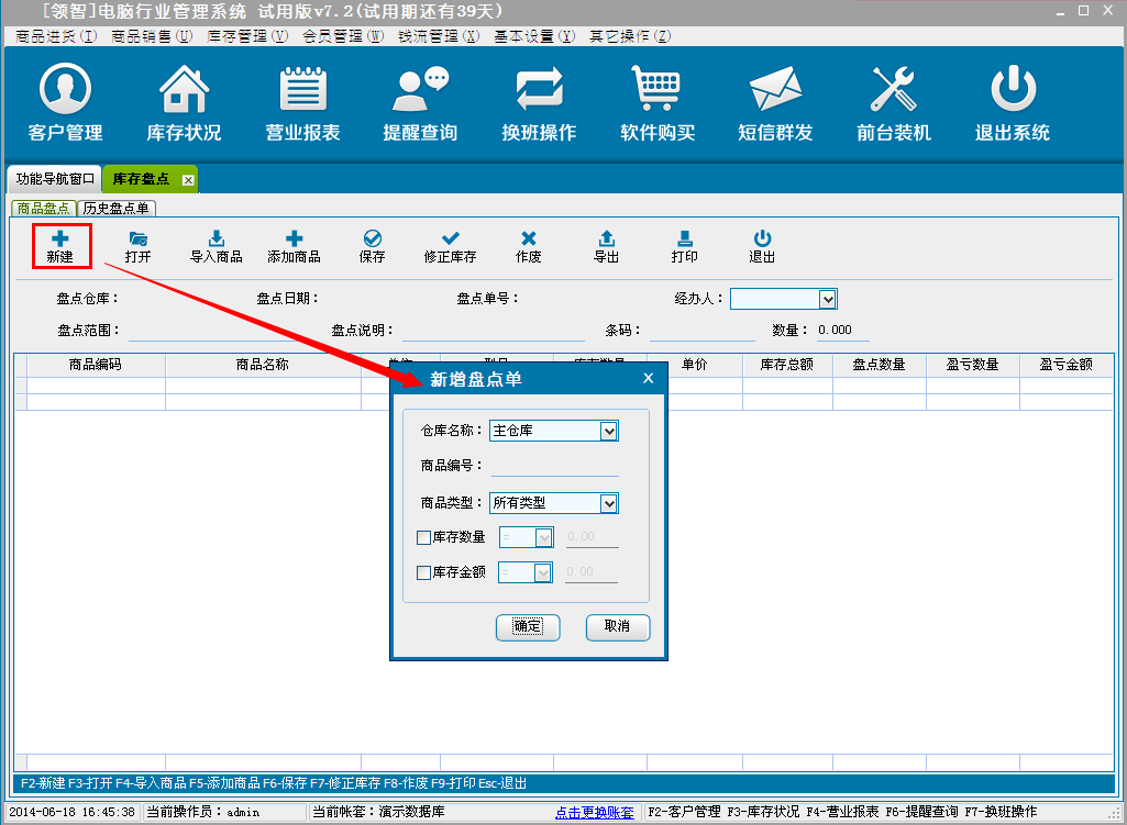 a:单击新建建立盘点单,可以选择指定的条件,单击确定建立盘点单。也可以建立空盘点单,然后通过导入商品货添加商品建立盘点单。