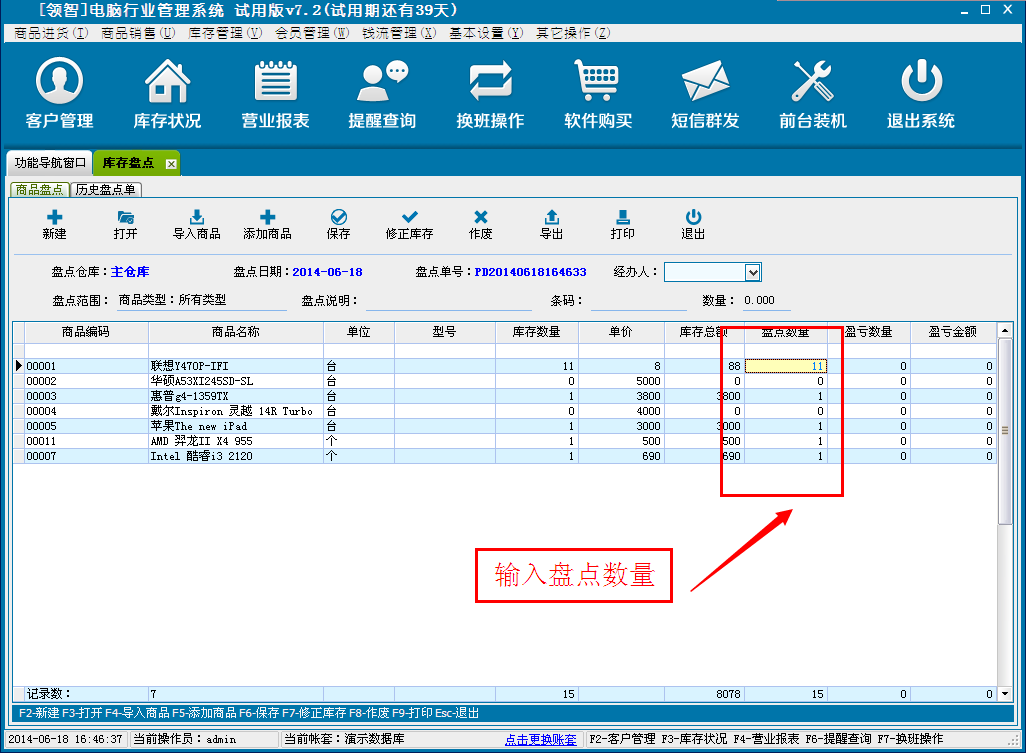 b:建立盘点单后,在盘点数量处输入盘点商品的盘点数量,产生盈亏金额和数量。单击作废取消本次盘点。