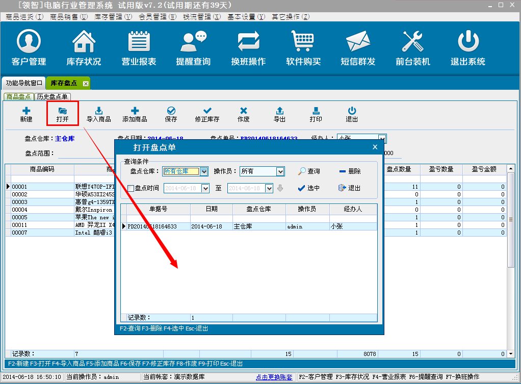 c:保存盘点单,单击保存即可保存盘点单,此时并没有更新商品库存的库存信息,只是把盘点单据进行了保存。保存的盘点单可点击打开,选择打开保存过的盘点单。