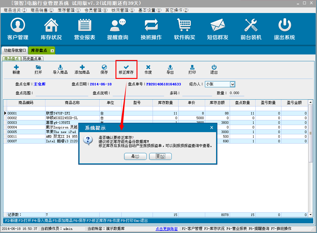 d:单击修正库存可以按当前商品的盘点数量对商品的库存数量进行修正,此时会根据盘点数量产生对应的商品报损报溢单据。请注意提示信息,单击是修正库存,单击否返回。