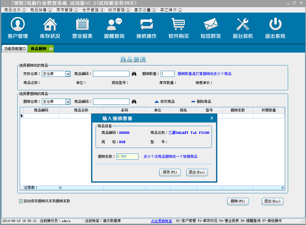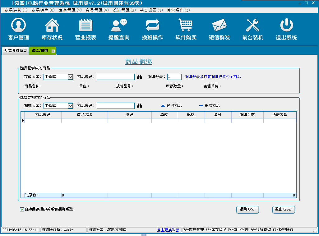 b:选择捆绑的仓库,选择被捆绑的商品,输入捆绑系统,保存。
