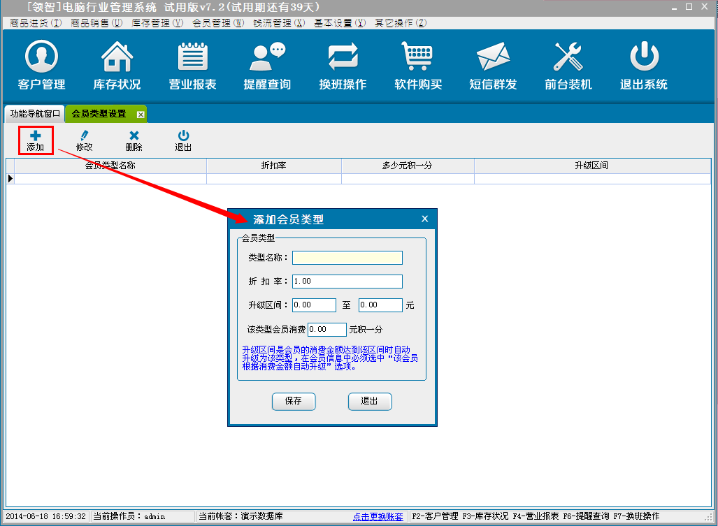 增加、修改、删除会员的类型,对会员类型名称、折扣率(折扣率为大于0小于等于1的小数,0.8即8折)、升级区间以及积分进行设置。