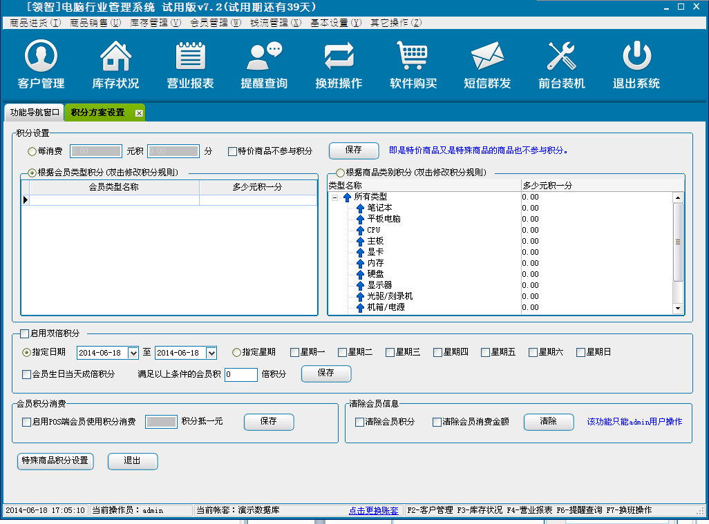 会员积分方案是对会员积分进行设置。可以按照消费金额、会员类型、指定日期、特殊商品进行积分。以及会员积分消费和清除会员信息。