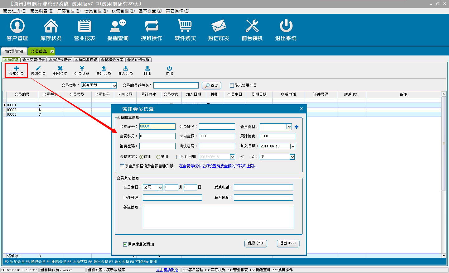 录入会员的基本信息,支持增加增加、修改、删除、excel电子表格导入、导出会员的基本信息,以及会员缴费。