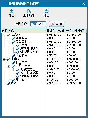 经营情况表是对指定月份的营业情况的综合统计。包含收入类、支出类、利润三大项。