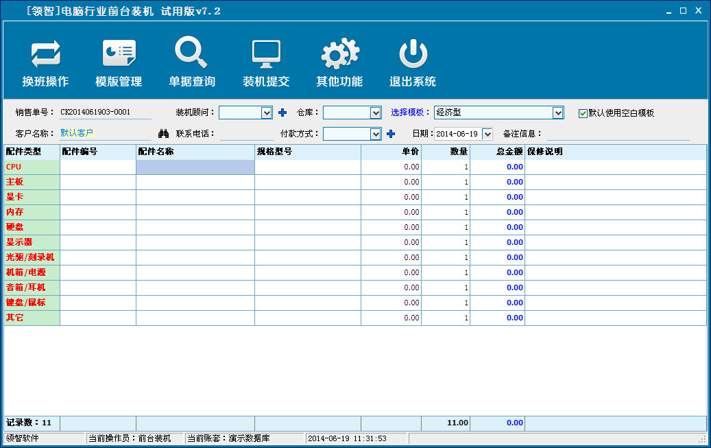 前台装机包含换班操作、模板管理、单据查询、装机提交、其他功能和退出系统,全面满足客户的DIY装机需求。