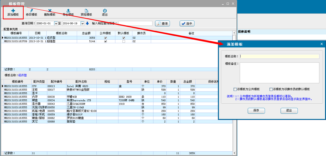 添加、删除、修改装模板,支持模板导出和预览。