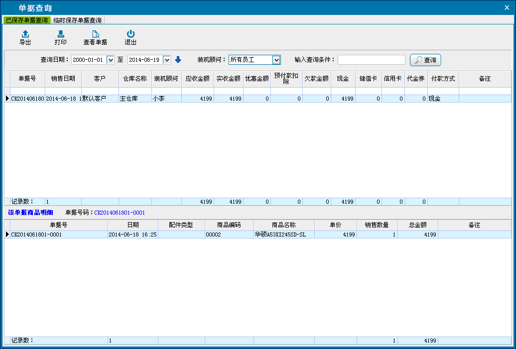 对已保存的单据和临时保存的单据进行查询。