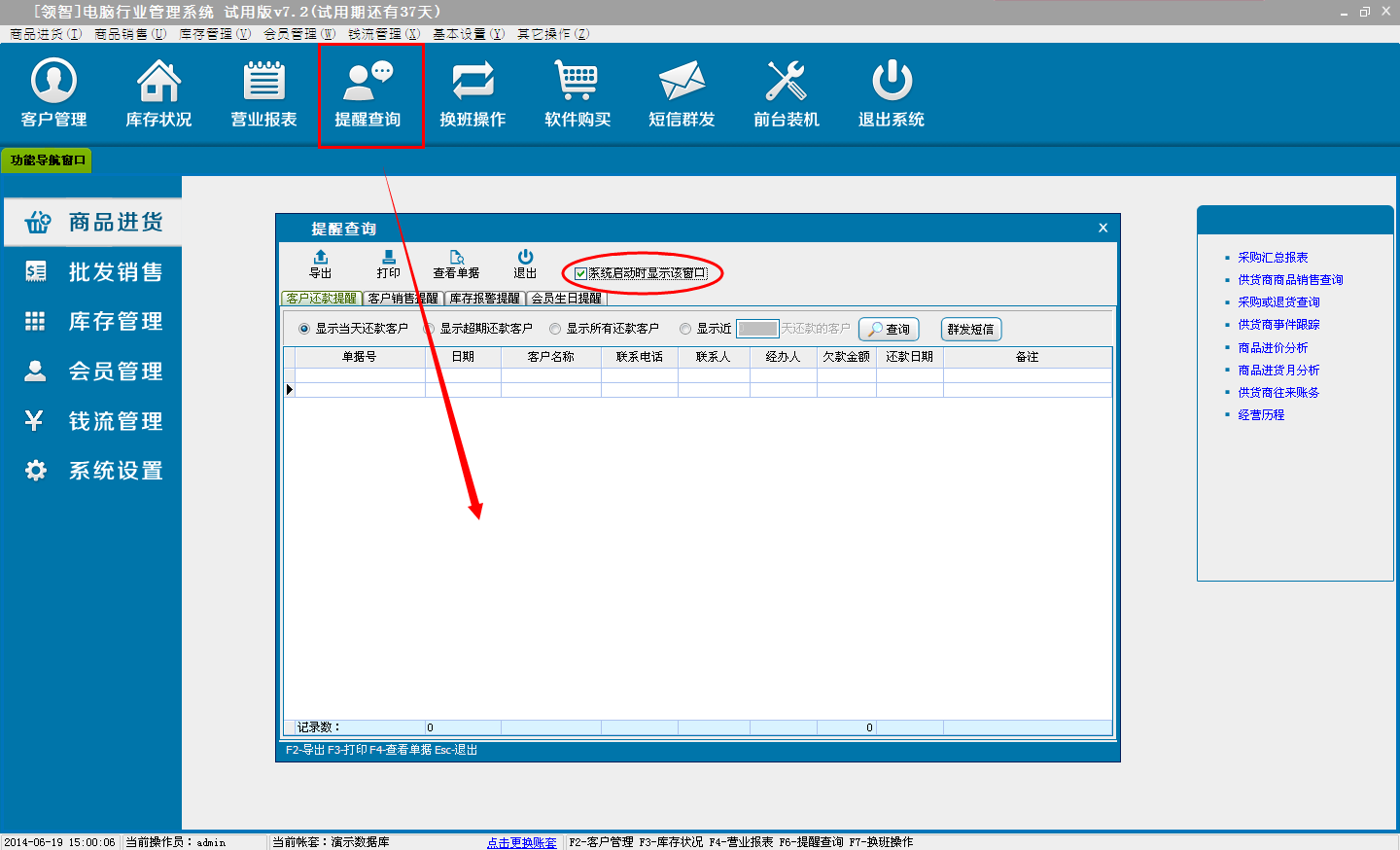 对一些重要信息的查询,可以设置在软件运行启动后显示该提醒窗口。包含客户还款提醒、库存报警提醒、客户销售提醒和会员生日提醒。